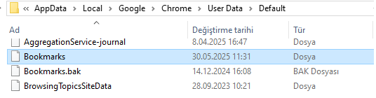 Bu dizine erişim sağladığınızda klasör içerisindeki bookmarks adlı dosya sizin yer imlerinizi içermektedir. Bu dosyaya zarar gelmemesi için onu kopyalayıp Masaüstü’ne aktarabilir ve orada işlemlerinizi gerçekleştirebilirsiniz.