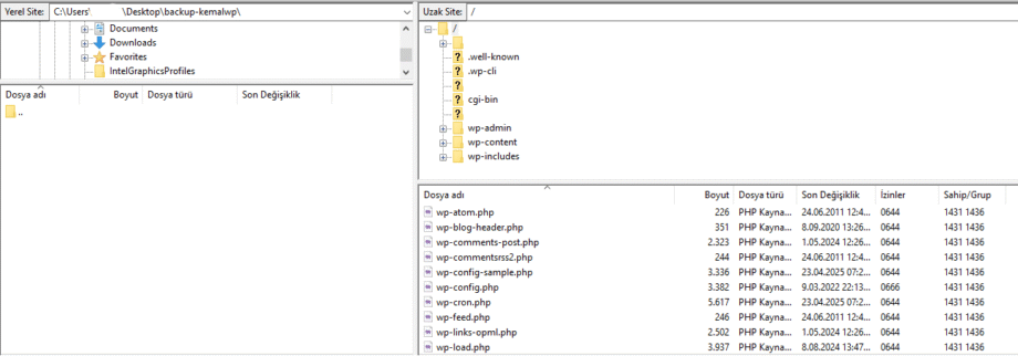 Hosting transfer sürecinde WordPress ya da benzer içerik yönetim sistemleri manuel olarak taşınmaktadır. Bu sebeple FTP hesap bilgilerinizi kullanarak taşıma işlemi yapacağınız WordPress dizinine gidiyoruz. Bu dizin içerisindeki WordPress yapısına ait dosyalarınızı bir transfer uygulaması (Filezilla gibi) kullanarak bilgisayarımıza indiriyoruz.